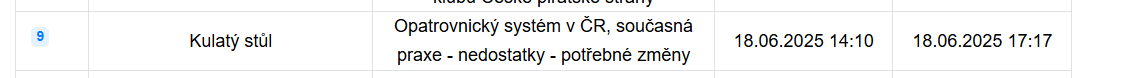 - Červen 2025 - Kulatý stůl Poslanecké sněmovny, který se konal dne 18. června 2025 od 14:10 na téma "Opatrovnický systém v ČR, současná praxe – nedostatky – potřebné změny". Na této schůzi jsem měla projev i já od času 16:38, týkal se dětí, které neměly to štěstí, že by soud rozhodl v jejich zájmu - příklady. Kulatý stůl je k poslechu veřejně dostupný a to ve video archívu Poslanecké sněmovny. https://videoarchiv.psp.cz/ Kulatý stůl lze vyhledat pod filtrem "Volby do PSPČR 2021" a doporučuji jej zhlédnout celý, neboť i tento obsahuje důsledky (aktuálně - dne 2.11. mi odkaz již nelze spustit, ostatní odkazy na záznamy před a po této akci fungují standardně. Bylo by, prosím, možné tento záznam znovu zpřístupnit veřejnosti?)